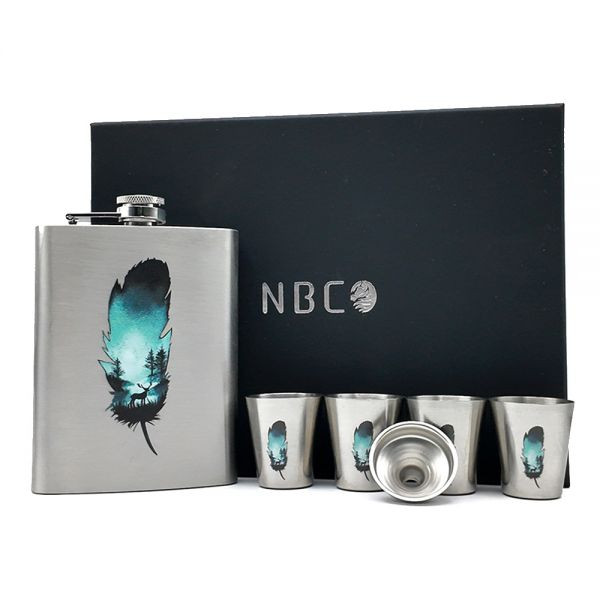 هیپفلاسک استیل برند NBC طرح پر ، داخل کاملا استیل ، قابل شستشو ، ضد بو ، دارای ۴ شات ، دارای قیف برای پر کردن ، جعبهی بسیار زیبا برای هدیه دادن ، حجم ۳۰۰ میل