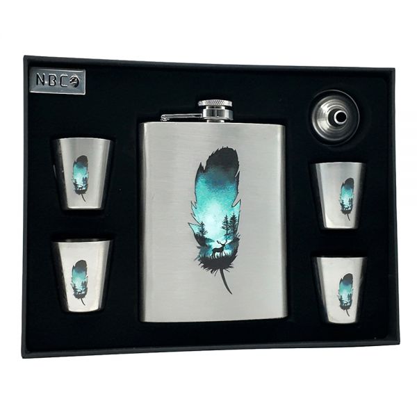 هیپفلاسک استیل برند NBC طرح پر ، داخل کاملا استیل ، قابل شستشو ، ضد بو ، دارای ۴ شات ، دارای قیف برای پر کردن ، جعبهی بسیار زیبا برای هدیه دادن ، حجم ۳۰۰ میل